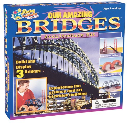 Our Amazing Bridges Kit. Bring out the science and art of creating bridges with this activity kit. Create your own scale models of various bridge types! This package contains: 1 landscape, 1 painting guide, two plaster mixes, 1 voussior mold, 1 sandpaper, 1 nylon thread, 2 adhesive squares, three wooden sticks, 1 paint set, 1 paintbrush, 1 marker, 1 sheet roadbeds, 1 sheet towers and supports, two tower bases, 2 achorages, 1 scraper, four A-gussets, four B-gussets, four C-gussets, twenty-nine I-beams, and 1 manual. Recommended for children ages 8 and up. WARNING: CHOKING HAZARD-Small parts. Not for children under 3 years.