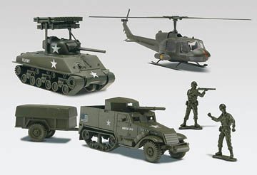 Kit contains 3 models. U.S. Army Bell UH-1B Huey helicopter with spinning rotors and two machine gun pods. Sherman rocket launcher tank with movable turret, cannon and launcher, also rolls on hidden wheels. U.S. Army M-3 Half Track with trailer and two figures. Peel 'n stick military graphics. Molded in olive drab and clear.
