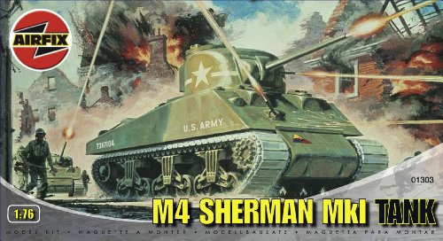 1-72 Scale. All airfix kits are highly detailed and come with decals, painting guide and detailed instructions. Skill level 2. 55 Pieces. The Sherman was designed in 1941 as an improvement on the earlier Lee and Grant medium tanks, and embodied the results of careful study of tank warfare in the early years of WW II. Following initial production in 1942, large numbers of Shermans were issued to the British Army and, as the war progressed, the type became accepted as the standard Allied medium tank. Various versions were built incorporating improvements in armament and performance. Amphibious Shermans played a leading role in the invasion of Normandy in1944. The Sherman Mk I weighed approximately 30 tons and had an armament of 1 turret mounted 75 mm gun and 2 light machine guns, the armour thickness being 3 inches.