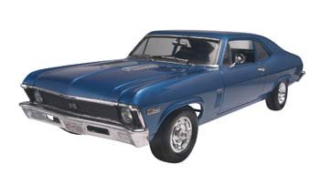 Chevy Nova body accurately molded in white polystyrene plastic. Detailed stock small block 350 engine or optional drag race version. Two hoods stock or racing, plus roll car and traction bars. Factory rally wheels or drag race wheels with rear slicks. Complete interior detail.