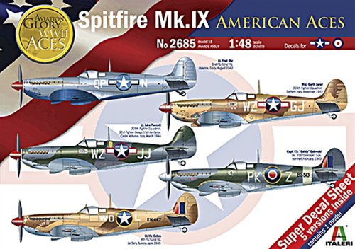 Highly detailed 1/48 scale assembly model kit of the venerable Supermarine Spitfire. This special version Italeri 1/48 scale assembly kit features the Spitfire Mark IX dedicated to the Second World War Aces. Kit includes Super Decal Sheet for 5 different versions: 1) Lt. Fawcett (309th Fighter Squadron, 31st Fighter Group, 15th Air Force, Castel Volturno, Italy, March 1944). 2) Maj. Jared 309th Fighter Squadron, Sothern Italy, November 1943. 3) Lt. Vic Cabas, 4th FS/52nd FG, Le Sers, Tunisia, April 1943. 4) Capt. F.S. "Gabby" Gabreski, No. 315 "Deblinski" Sqn. Northolt,February, 1943. 5) Lt F. Ohr, 2nd FS/52nd FG, Palermo, Sicily, August 1943.